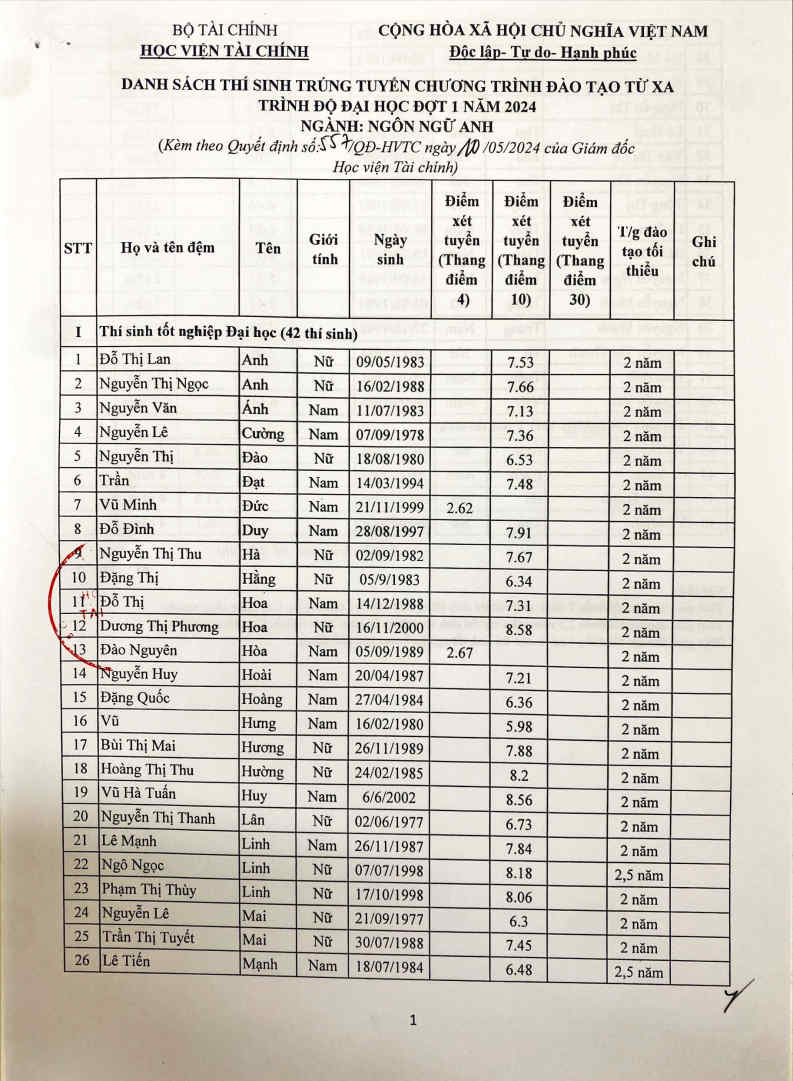 Thông báoDanh sách thí sinh trúng tuyển Chương trình đào tạo từ xa, trình độ Đại học ngành Ngôn ngữ Anh đợt 1 năm 2024 Posted on 13/05/2024 by Ban Điều Hành Chương Trình Đào Tạo Từ Xa 13 Th5 Danh sách thí sinh trúng tuyển Chương trình đào tạo từ xa, trình độ Đại học ngành Ngôn ngữ Anh đợt 1 năm 2024 Thông báo tuyển sinh chương trình đào tạo từ xa trình độ đại học đợt 1 năm 2024 (Ngành: Kế toán và Quản trị kinh doanh) Danh sách thí sinh trúng tuyển Chương trình đào tạo từ xa, trình độ Đại học ngành Kế toán và ngành Quản trị kinh doanh đợt 1 năm 2024