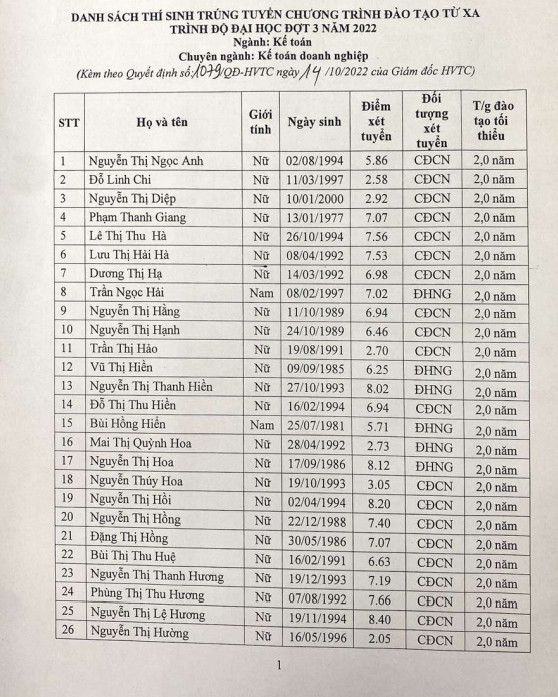 1. Danh sách thí sinh trúng tuyển Chương trình đào tạo từ xa, trình độ Đại học đợt 3 (Chuyên ngành Kế toán doanh nghiệp)