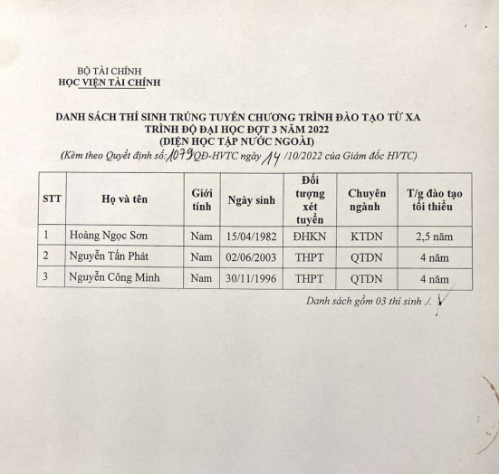 3. Danh sách thí sinh trúng tuyển Chương trình đào tạo từ xa, trình độ Đại học đợt 3 (Theo diện nước ngoài)