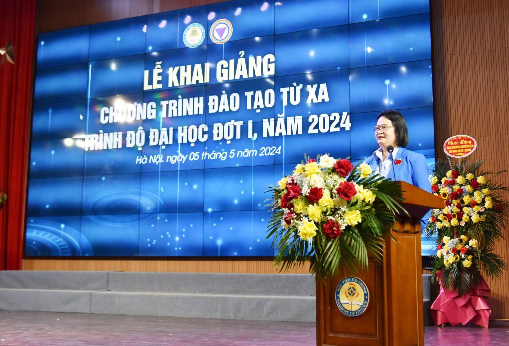 Phát biểu Khai mạc, NGƯT. PGS.,TS. Trương Thị Thủy – Phó Bí thư Đảng ủy, Phó Giám đốc Học viện Tài chính đã nhiệt liệt chào đón 171 tân sinh viên đợt 1 năm 2024 vừa gia nhập Ngôi nhà chung – Học viện Tài chính và khẳng định sự lựa chọn chương trình đào tạo từ xa với hình thức học tập E- Learning của Học viện Tài chính của các tân sinh viên là đúng đắn, sáng suốt. Bên cạnh việc truy cập không giới hạn vào bài giảng, người học còn có thể được cung cấp quyền truy cập vào những nội dung được cập nhật mới nhất ở bất cứ dâu, bất cứ thời gian nào chỉ cần có điện thoại hoặc máy tính được kết nối Internet. Nhu cầu nguồn nhân lực chất lượng cao trong quản lý kinh tế tài chính là rất lớn và Học viện Tài chính là nơi “cung cấp các sản phẩm đào tạo và nghiên cứu khoa học, tài chính, quản trị kinh doanh, kế toán chất lượng cao cho xã hội” với giá trị cốt lõi là: chất lượng – uy tín – hiệu quả – chuyên nghiệp và hiện đại. Học viện Tài chính là nơi có bề dày truyền thống với hơn 60 năm xây dựng và phát triển.